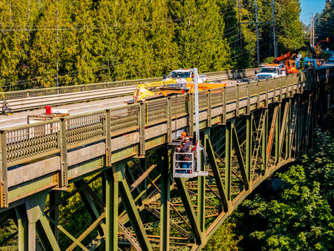 SB Structures was called out by WSDOT for an emergency repair on the SR 169 Green River Bridge. The crews used booms to lift themselves over the edge and under the bridge, and in a couple scenarios, all the way under to the other side of the bridge, in order to get to the repair locations.